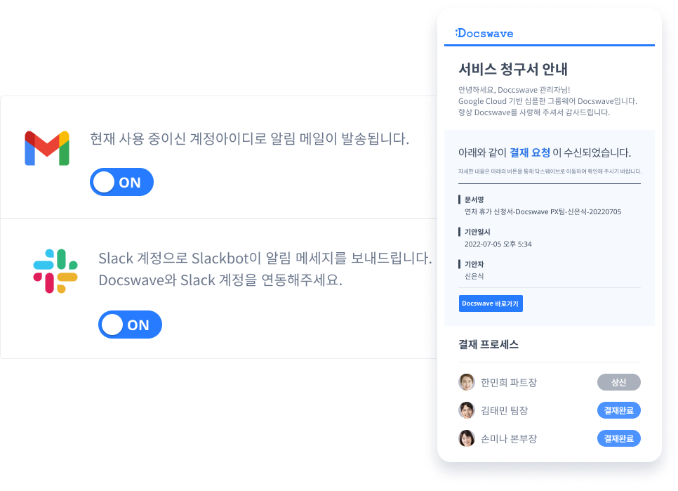 결재 시, 이메일 알람 기능이 있어, 언제 어디서나 스마트폰만 있으면 확인하고 결재할 수 있어서 좋습니다.또한 문서 분류가 자동으로 된 상태에서 구글 드라이브에 저장되어 있으므로 필요시 언제든지 열람할 수 있어서 매우 좋습니다.